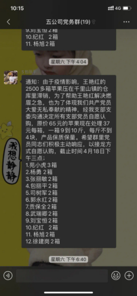 4月18日,烏海廣播電視臺公眾號發(fā)布一條《急急急!2萬多斤評估滯銷,快來幫幫這個(gè)烏海姑娘!》信息,我市一位名叫王艷紅的農(nóng)戶從新疆果園運(yùn)回近3000箱阿克蘇冰糖心蘋果,受今年新冠肺炎疫情影響,2500多箱蘋果一直壓在千里山鎮(zhèn)的倉庫,隨著天氣轉(zhuǎn)暖,錯(cuò)過最佳售賣時(shí)機(jī),保鮮庫也存放不了多久,王艷紅焦急萬分,到處找銷路。市熱力有限責(zé)任公司第五分公司黨支部書記苑小虎得知這一消息后,第一時(shí)間與支部委員商議,最終決定以接龍方式在公司微信群開展自愿認(rèn)購活動(dòng)。