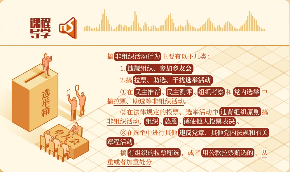 黨內(nèi)選舉是黨內(nèi)政治生活的重要組成部分?!蛾P(guān)于新形勢下黨內(nèi)政治生活的若干準(zhǔn)則》規(guī)定,黨內(nèi)選舉必須體現(xiàn)選舉人意志,堅決防止和查處拉票賄選等行為。在選舉活動中搞非組織活動,干擾選舉人表達(dá)選舉意愿,侵犯其他被選舉人權(quán)益,侵蝕黨內(nèi)政治文化,在黨員群眾中造成不良影響,對這類違反組織紀(jì)律的行為必須予以堅決懲治。