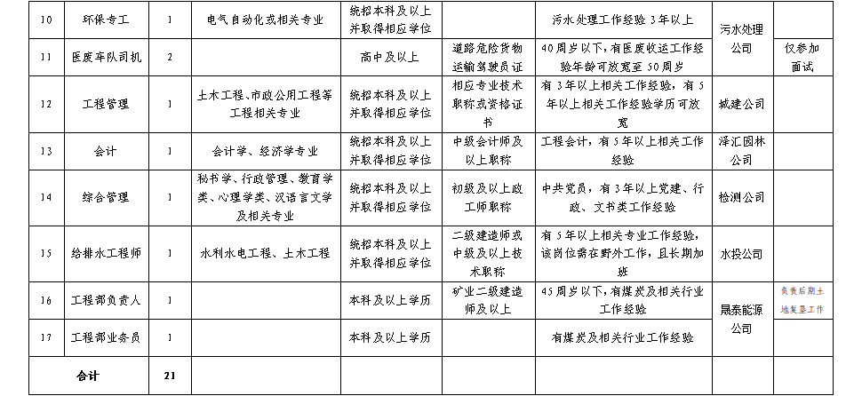 本次計(jì)劃招聘21人,其中應(yīng)屆畢業(yè)生9人。具體崗位及學(xué)歷、專業(yè)、資格條件詳見《烏海市城市建設(shè)投資集團(tuán)有限責(zé)任公司2024年公開招聘崗位需求表》(以下簡稱《崗位需求表》(附件)。