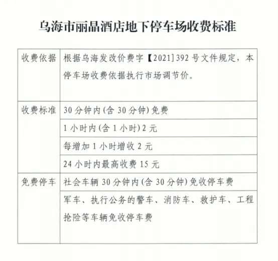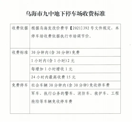 為緩解地面停車壓力,引導(dǎo)車輛有序停放,烏海市濱河九中地下停車場(chǎng)與麗晶國(guó)際酒店地下停車場(chǎng)已完成智能化升級(jí)改造。2024年7月25日經(jīng)海勃灣區(qū)城市管理綜合執(zhí)法局批準(zhǔn),兩個(gè)停車場(chǎng)于近期正式開(kāi)展停車收費(fèi)管理,收費(fèi)標(biāo)準(zhǔn)見(jiàn)下表:
