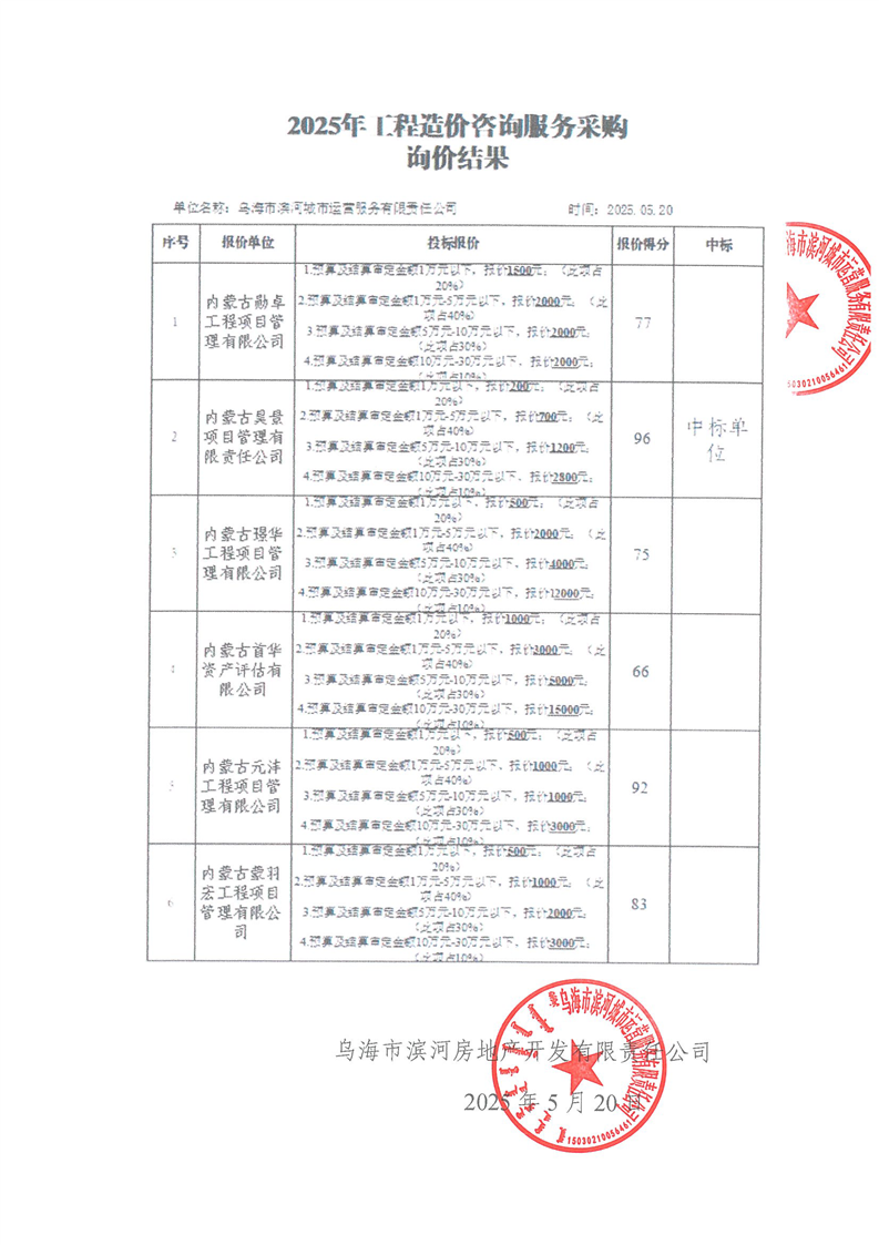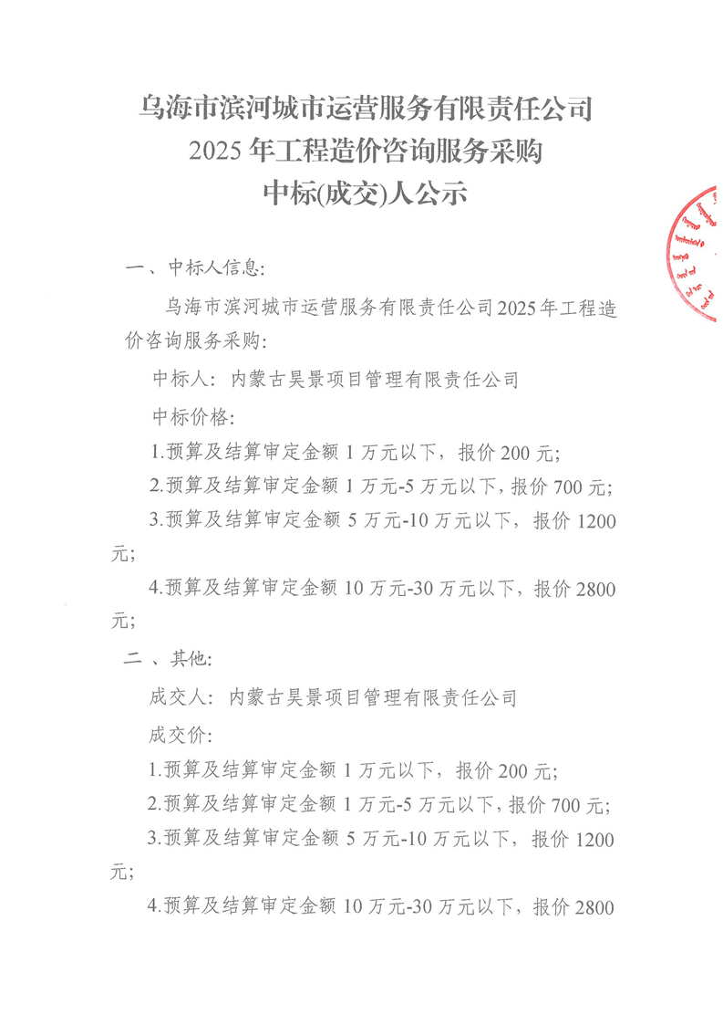 烏海市濱河城市運(yùn)營(yíng)服務(wù)有限責(zé)任公司2025年工程造價(jià)咨詢(xún)服務(wù)采購(gòu)中標(biāo)(成交)人公示