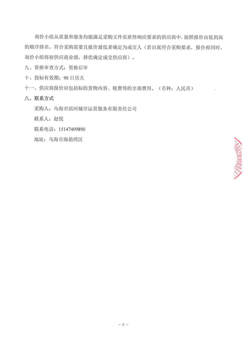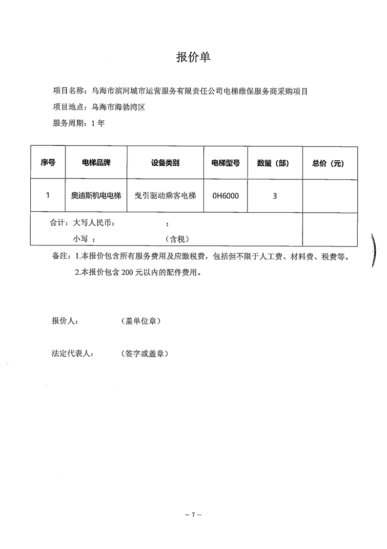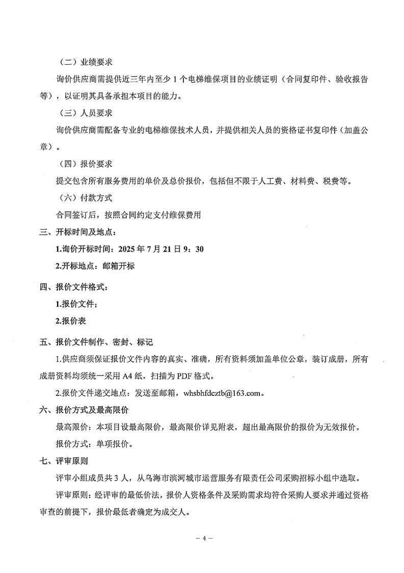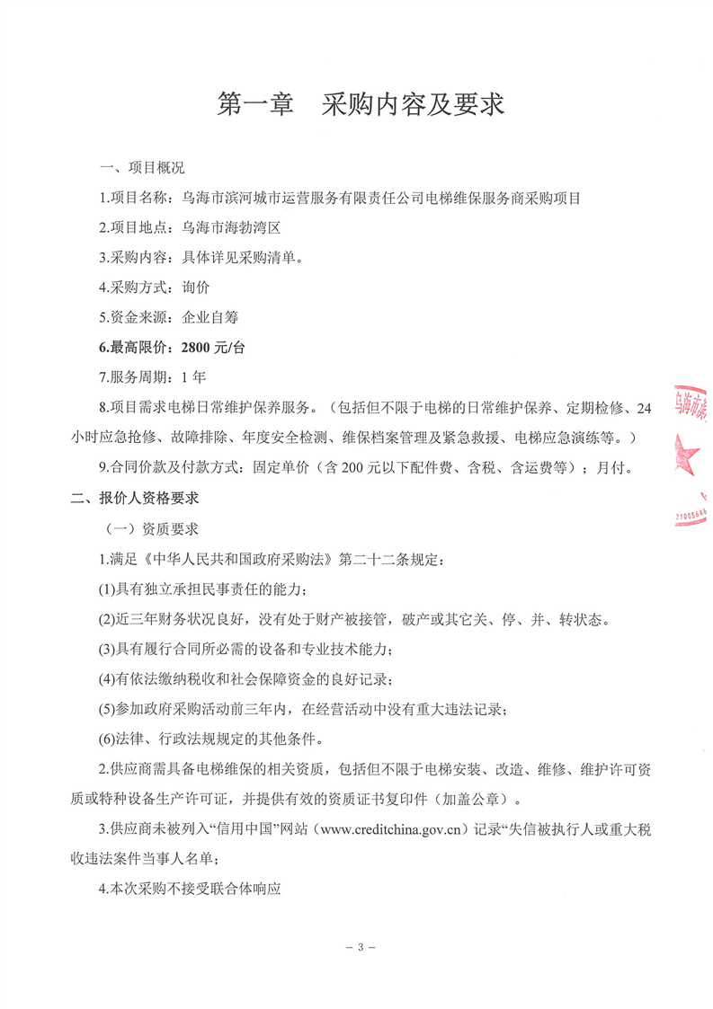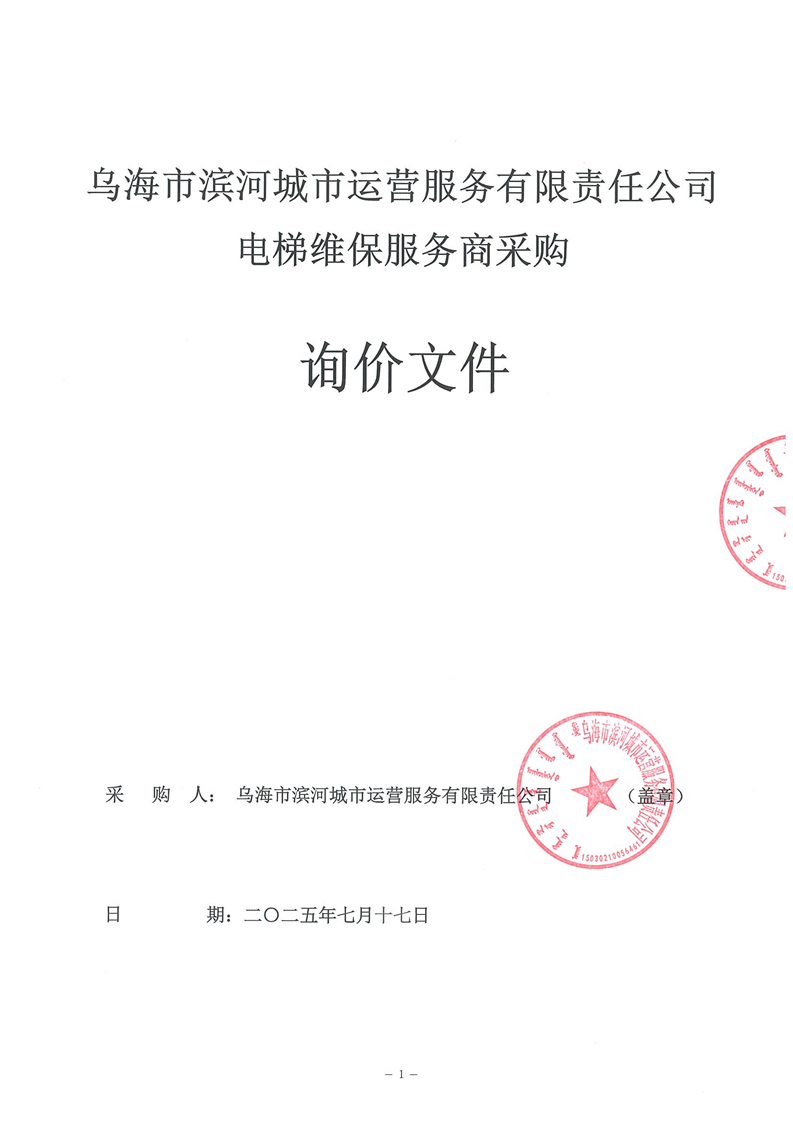 烏海市濱河城市運(yùn)營(yíng)服務(wù)有限責(zé)任公司電梯維保服務(wù)商采購(gòu)詢價(jià)文件