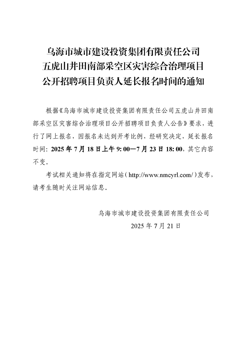 烏海市城市建設(shè)投資集團(tuán)有限責(zé)任公司五虎山井田南部采空區(qū)災(zāi)害綜合治理項(xiàng)目公開招聘項(xiàng)目負(fù)責(zé)人延長報(bào)名時(shí)間的通知
